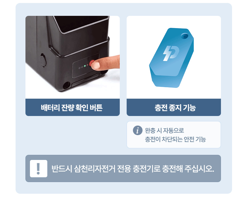 · A/S 기간 : 차체(배터리 제외) 1년, 배터리 및 부품 6개월 (단, 고객과실 제외)